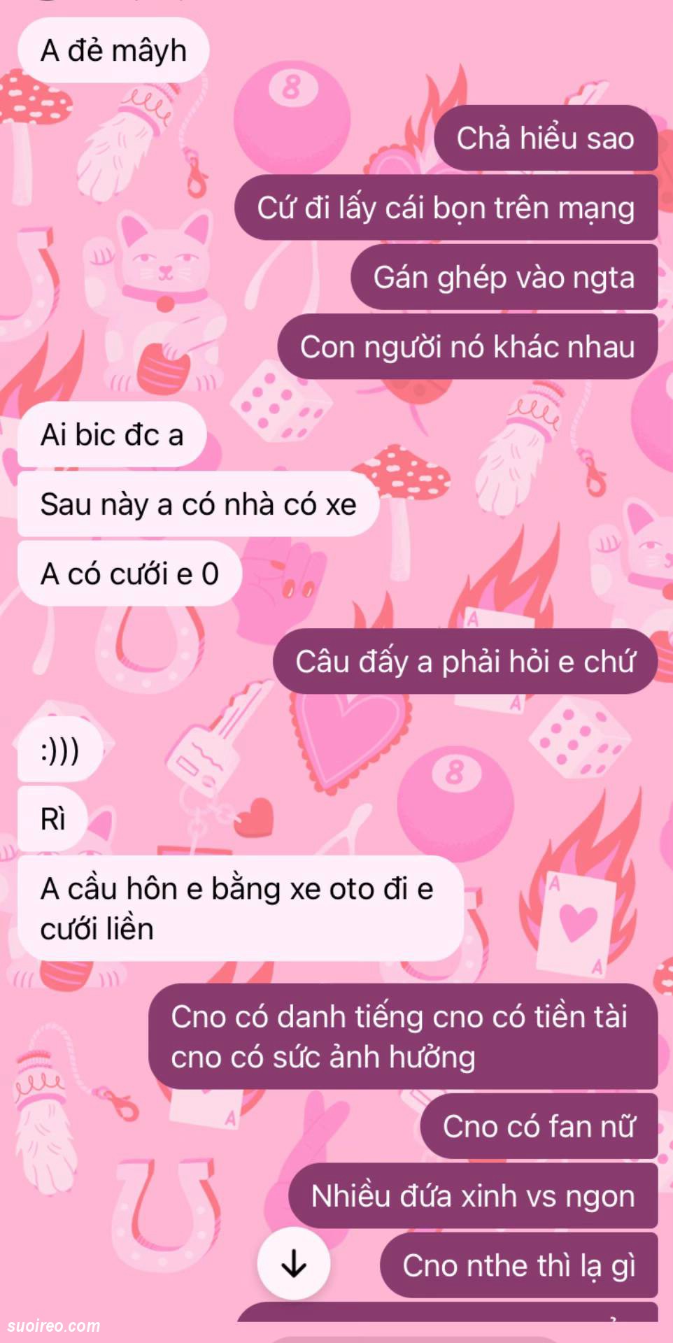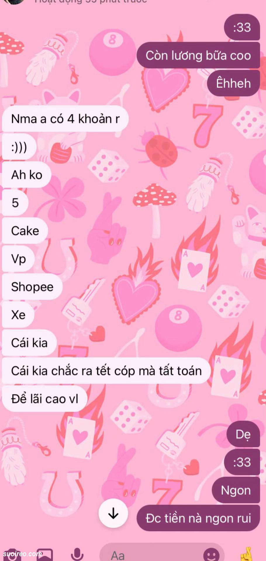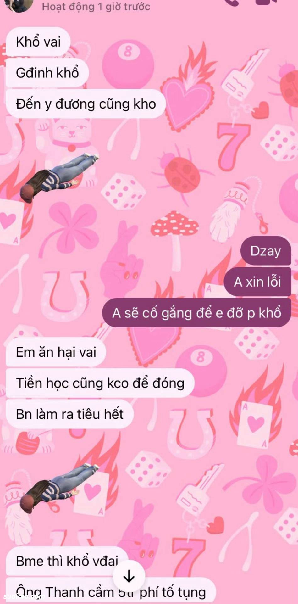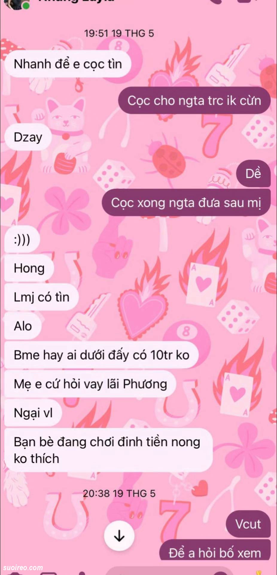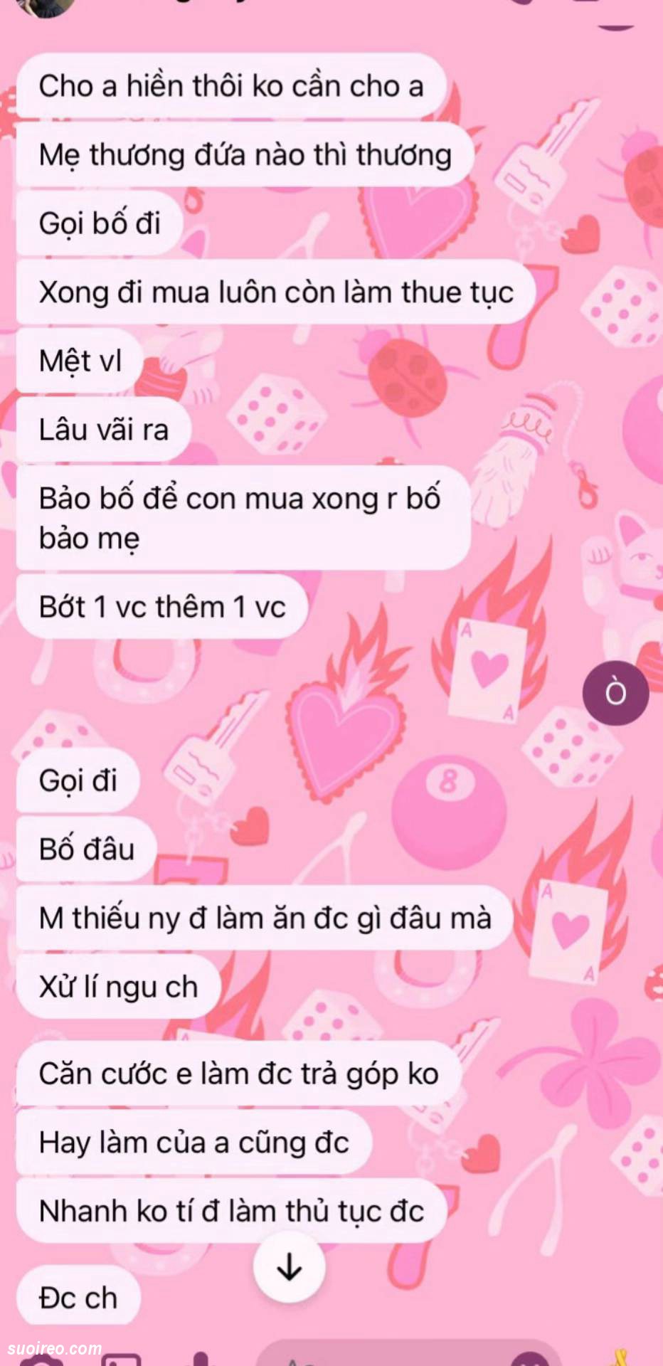 Đọc đoạn tin nhắn mà tôi sục máu thằng này ngu quá. Con nhỏ này đào mỏ nó rõ ràng. Mà nó vẫn gáng kiếm tiền cho con này. Khi hết tiền. Con này còn soạn văn kêu thằng này mượn tiền bố mẹ đưa cho nó. Khi bố mẹ hết cho mượn tiền. Thì con này biểu thằng này mượn nợ giang hồ cho nó đi. Thằng này cũng làm theo